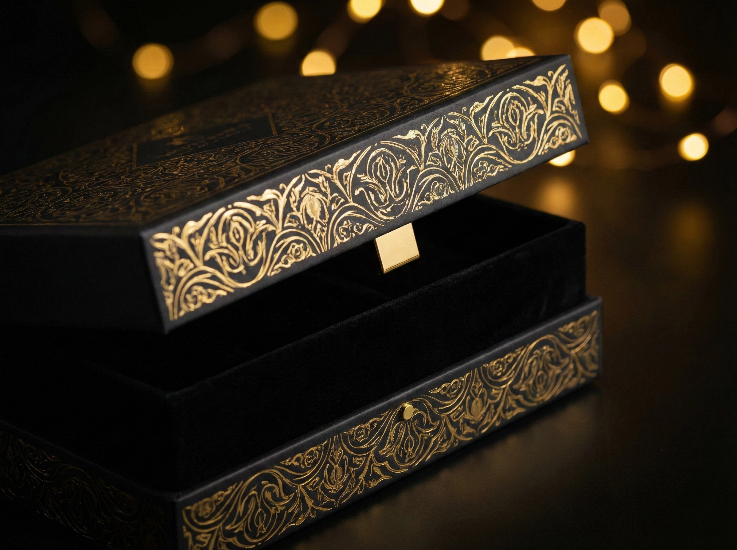 كرتون مقوى بكسوة فاخرة، بصمة ذهبية، ومغناطيس للإغلاق.